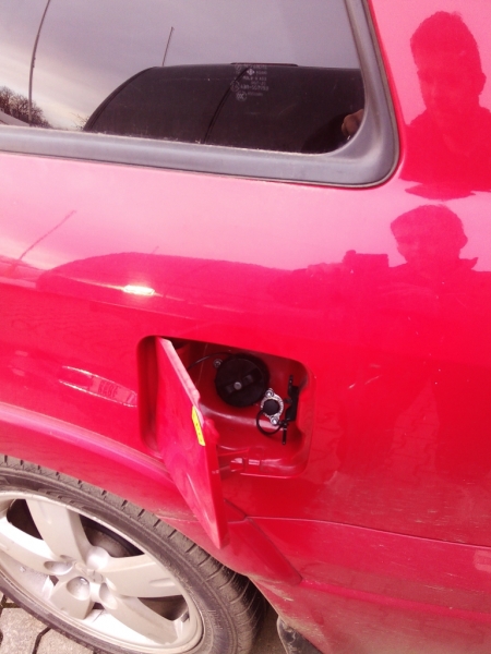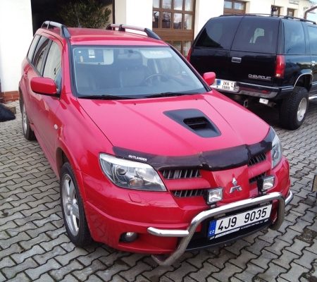 Mitsubishi Outlander, přeplňovaný dvoulitr se 148kW přestavěný na LPG s prvotřídním zařízením BRC, nádrží v kufru místo rezervy a přípojkou plnění LPG u benzínu.