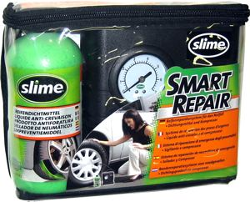 Sada obsahuje kompresor a náplň pro 1 kolo. Velkou výhodou této sady je, že pokud dojedete do pneuservisu, zde tuto směs z pneumatiky vypláchnou vodou a pneumatiku Vám běžným způsobem opraví. Ukázka použití opravy hmotou Slime zde